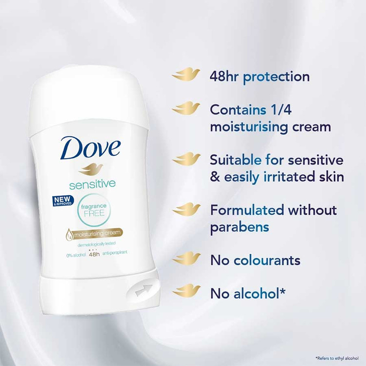 استیک ضدتعریق بدون رایحه داو سنسیتیو Dove Sensitive محافظت کننده 48 ساعته خشکی و تازگی زیر بغل به همراه یک چهارم کرم مرطوب کننده داو برای تغذیه و لطافت پوست می باشد. استیک سنسیتیو داو همچنین دارای فرمول بدون رایحه برای مراقبت ویژه از پوست های حساس است. این عملکرد به همراه فرمول بدون الکل با خاصیت تسکین دهنده و محافظت کننده پوست زیر بغل پس از شیو کردن تکمیل می شود و احساس پوستی تازه، لطیف و محافظت شده را به ارمغان می آورد.