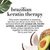 شامپو کراتین او جی ایکس، غنی شده از روغن نارگیل کاکائو برزیلی و پروتئین های کراتین سبب ایجاد و تقویت مو میگردد. با استفاده از این شامپو ترکیب منحصر به فرد از روغن مهره کاکائو آلی، پروتئین کراتین غنی، روغن آووکادو و کره کاکائو میباشد که موهای شما را صاف و ابریشمی می کند. این شامپو تقویت کننده و درخشان کننده موها نیز می باشد. این شامپو در حجم بسته بندی 385ml عرضه میشود.