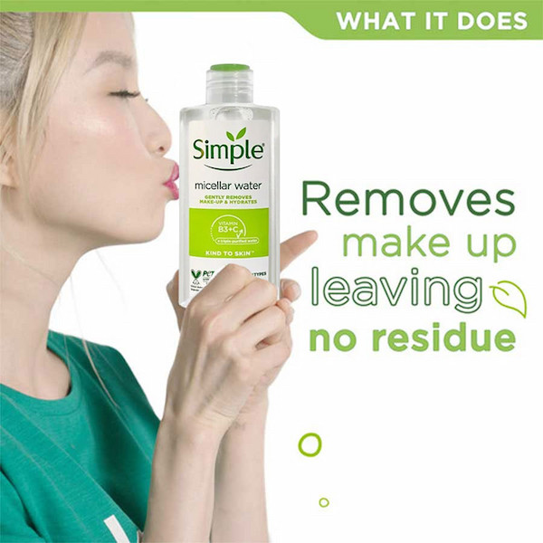 میسلار واتر پاک کننده آرایش و آبرسان از برند انگلیسی سیمپل، مناسب برای انواع پوست به ویژه پوست های حساس است.این میسلار واتر فاقد مواد صابونی و با فرمولاسیون بدون تحریک پوست تولید میشود. به این ترتیب با خیال راحت صورت خود را از آلودگی و آرایشهای روزانه پاک کنید. به دلیل عدم نیاز به آبکشی میتوانید در هر جایی که هستید، پوست خود را تمیز و تازه کنید.این میسلارواتر وگان و دارای ترکیبات طبیعی است و مناسب برای پاک کردن آرایش صورت، لب و چشم می باشد و ملایم ترین میسلار واتر این برند می باشد.