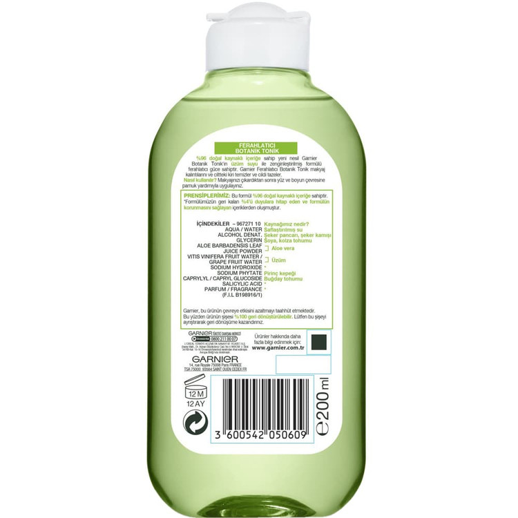 تونر پاک کننده پوست با عصاره انگور بوتانیکال گارنیه، موجب شادابی و طراوت پوست می شود. این تونر بدون نیاز به شستشو، هرگونه آلودگی و بقایای آرایش روی صورت را پاک کرده، مکمل پاک کنندگی فوم شوینده، مکمل درمان آکنه و پایه ی کرم های مرطوب کننده است. این تونر علاوه بر پاک کنندگی عمقی منافذ و سلول های مرده سطح پوست، موجب نرمی و لطافت پوست نیز می شود. پس از استفاده از این تونر رطوبت طبیعی پوست حفظ شده؛ از خشکی و کشیدگی جلوگیری می کند و مانع چرب شدن سریع پوست می گردد.