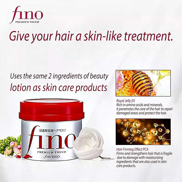 ماسک موی شیسیدو فینو Fino Premium Touch از لاین مراقبت حرفه ای موی برند ژاپنی شیسیدو دارای فرمول پرمیوم و حاوی مواد موثر باکیفیت درمانی و مراقبت از پوست برای ترمیم کنندگی، تغذیه کنندگی و مراقبت از سلامت موها است. ماسک موی فینو پرمیوم تاچ حاوی ژل رویال زنبور عسل غنی از آمینو اسیدها و مواد معدنی برای نفوذ عمقی و ترمیم موهای آسیب دیده است. این ترکیب همچنین حاوی PCA به عنوان ترکیب کلیدی سفت کننده پوست است که باعث کاهش شکنندگی و افزایش استحکام موها می شود. این مواد موثر با عصاره جلبک دریایی برای شانه کشی آسان، امولسیون اسکوالن و مروارید برای رطوبت رسانی و درخشان کنندگی و گلوتامیک اسید برای محافظت از کیفیت رنگ مو همراه شده است. نتیجه موهایی عمیقا تغذیه شده، انعطاف پذیر و محافظت شده خواهد بود.