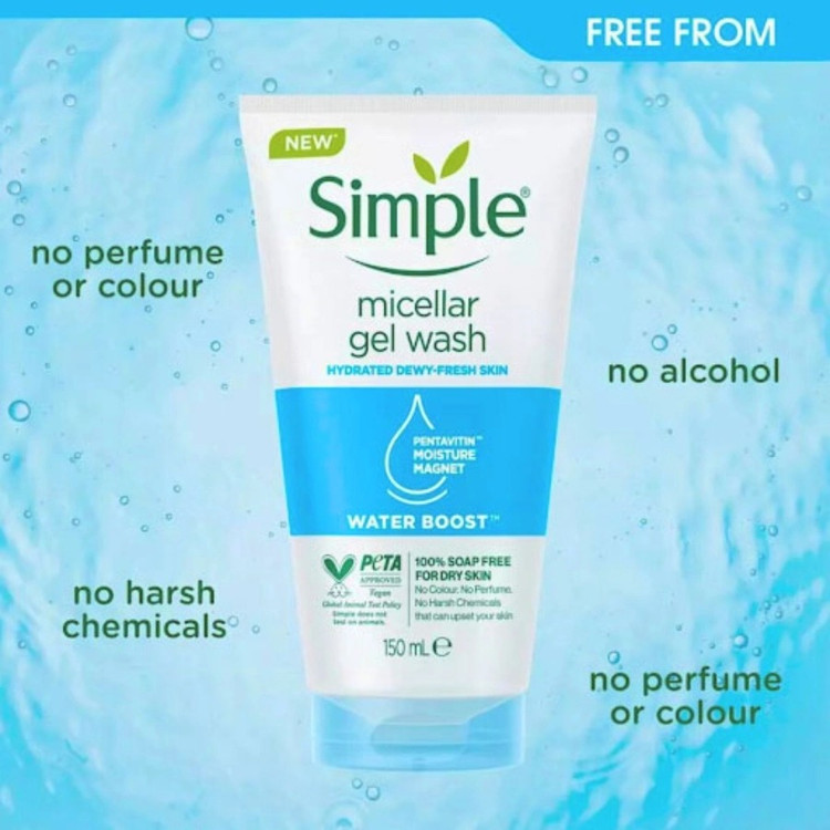 شوینده سیمپل مدل میسلار واتر بوست حاوی پنتاویتین TM است (که ماده ای 7000 برابر کوچکتر از مولکول HA است) و میتواند در کنار پاکسازی پوست به رطوبت رسانی فوری کمک نموده که در نتیجه و حالت ارتجاعی پوست را کاهش نخواهد داد.