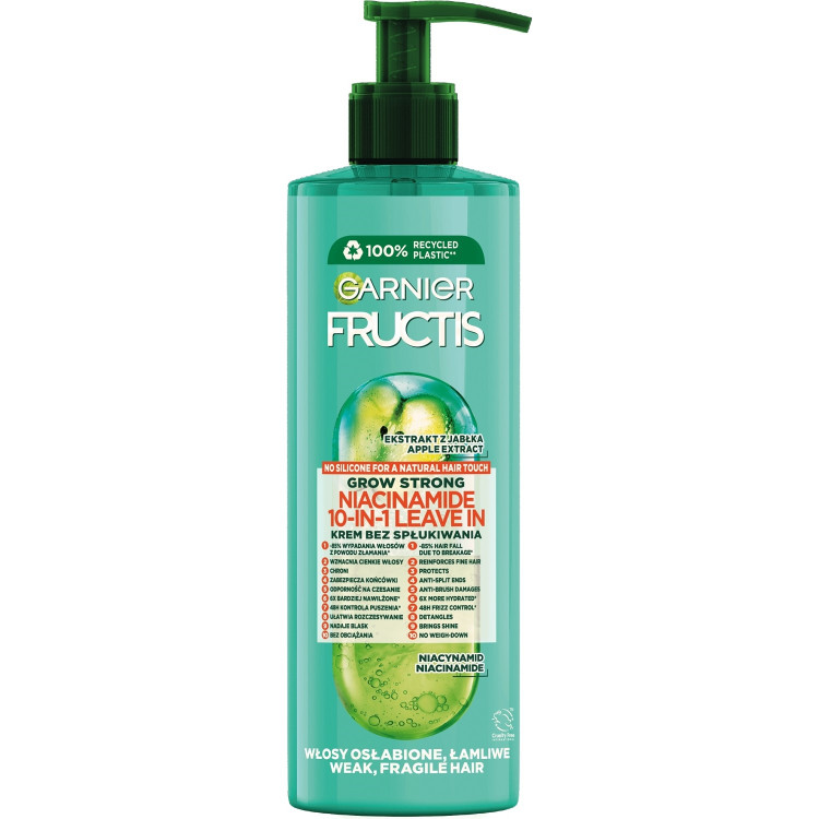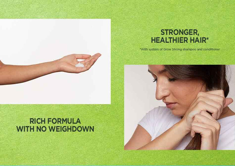 کرم مو ده کاره فوق سبک Grow Strong گارنیه دارای عصاره سیب با نیاسین است. این مواد باعث تقویت موهای ضعیف و نازک با تمایل به شکستگی می شوند. این محصول به لطف فرمول سبکی که دارد، برای موهای نازک عالی است.این ماده از دو شاخه شدن موها جلوگیری می کند، موها را مرطوب و صاف می کند.