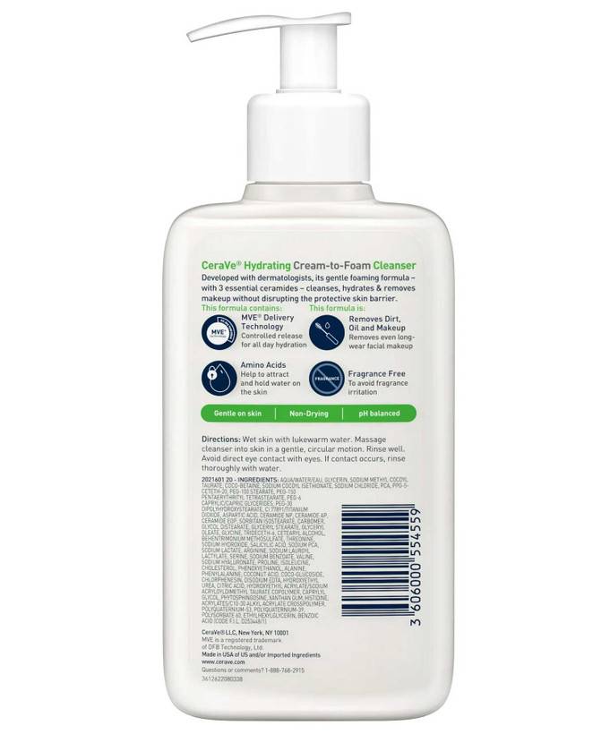 تمامی محصولات CeraVe با داشتن سه سرامید ضروری (1, 3, 6-II) به بازیابی و حفظ سد طبیعی پوست کمک میکنند. گلیسیرین نیز ترکیبی است که به مرطوب کردن پوست و جلوگیری از خشکی کمک میکند. ژل شستشو پوست نرمال تا خشک سراوی با برخورداری از تکنولوژی تحویل ام وی ای (MVE Delivery Technology) بطور مداوم ترکیبات مرطوبکننده و تغذیهکننده را برای آبرسانی مداوم در طول روز، آزاد میکند.