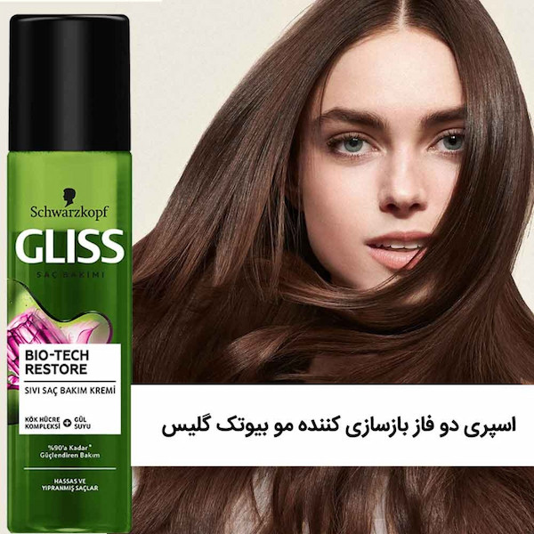 نرمکنندهی موجود در اسپری گلیس موها را نرم و لطیف و همچنین خوشحالت میکند و زبری موهای آسیبدیده را کاهش میدهد. اسپری دوفاز مدل (Biotech Restore) خاصیت ترمیمکنندگی نیز دارد و قادر است موهای آسیبدیده را تاحدی قابلقبول بهبود دهد و ترمیم کند. این اسپری تا ده لایه از هر تار مو نفوذ میکند و تاثیر میگذارد. از ویژگیهای این اسپری مو تاثیر محسوس و سریع آن بر روی مو است. سرم و اسپری های مو علاوهبر خاصیت ترمیمکنندگی که دارند باعث میشوند مو حالتی خوب پیدا کند و برای سشوار کشیدن و حالت دادن به مو آماده شود. تفاوت بین اسپری های دوفاز و تک فاز در این است که اسپریهای دوفاز برای موهای بسیار خشک مورد استفاده قرار میگیرند زیرا فاز دوم این اسپریها بیشتر حاوی چربی است که برای موهای خشک حالت ترمیمی هم داشته باشد. اسپریهای تک فاز برای انواع موها قابل استفاده هستند و به خوشحالت شدن موها کمک فراوانی میکنند. محصولات برند آلمانی «گلیس» (Gliss) که زیرمجموعهی کمپانی معتبر و محبوب «شوارتسکف» (Schwarzkopf) هستند، از مرغوبیت بالایی برخوردارند که خرید این محصولات کاملاً تضمین شده خواهد بود.