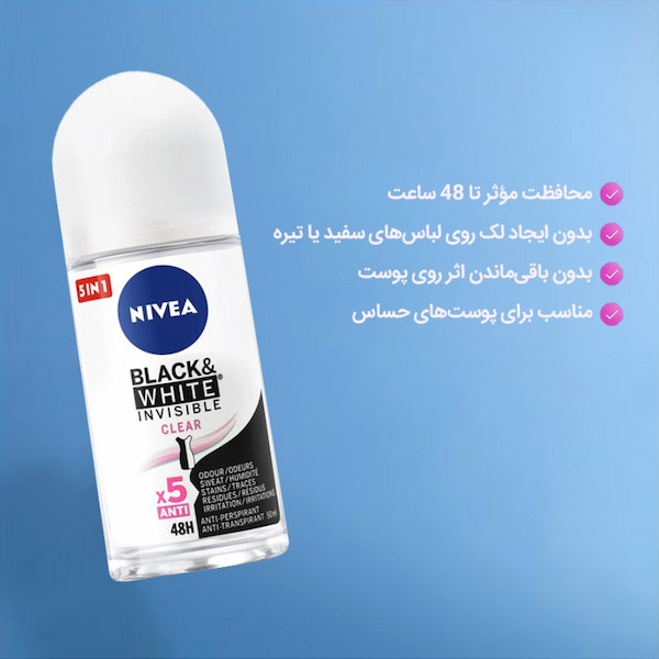 رول ضد تعریق زنانه نیوا Invisible Black & White Clear یک محصول ضد تعریق عالی برای محافظت روزانه در برابر تعریق و بوی نامطبوع بدن است که بدون ایجاد لکه روی لباس های مشکی یا سفید از پوست محافظت میکند..